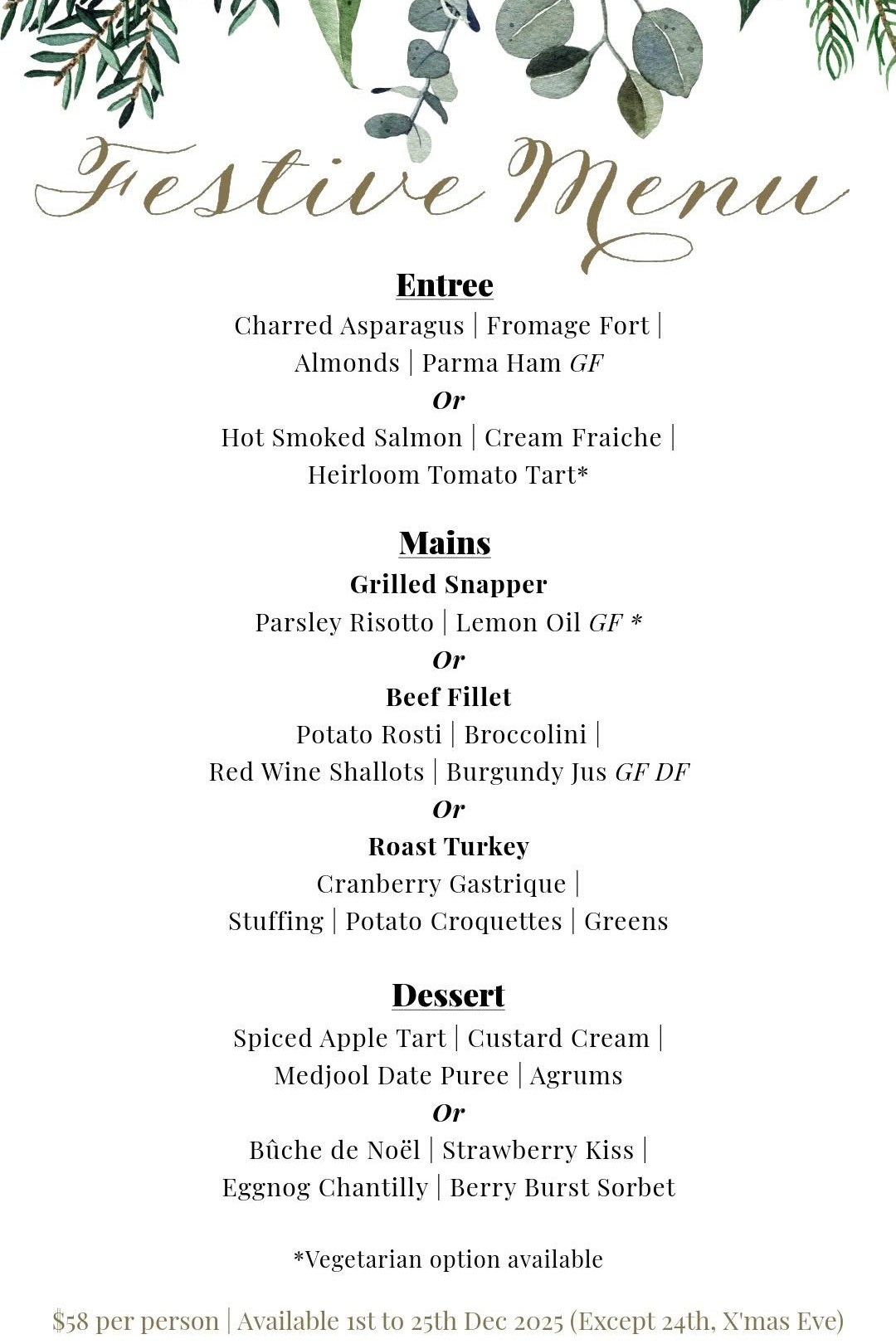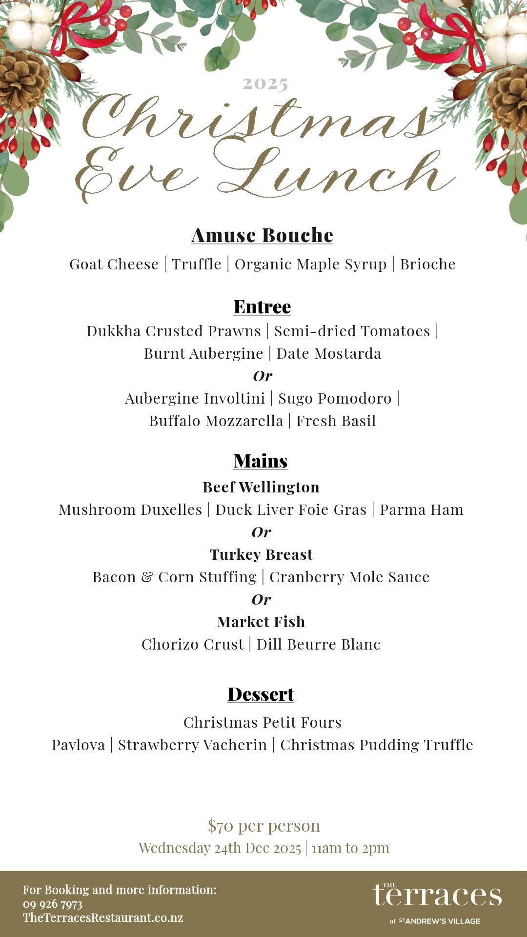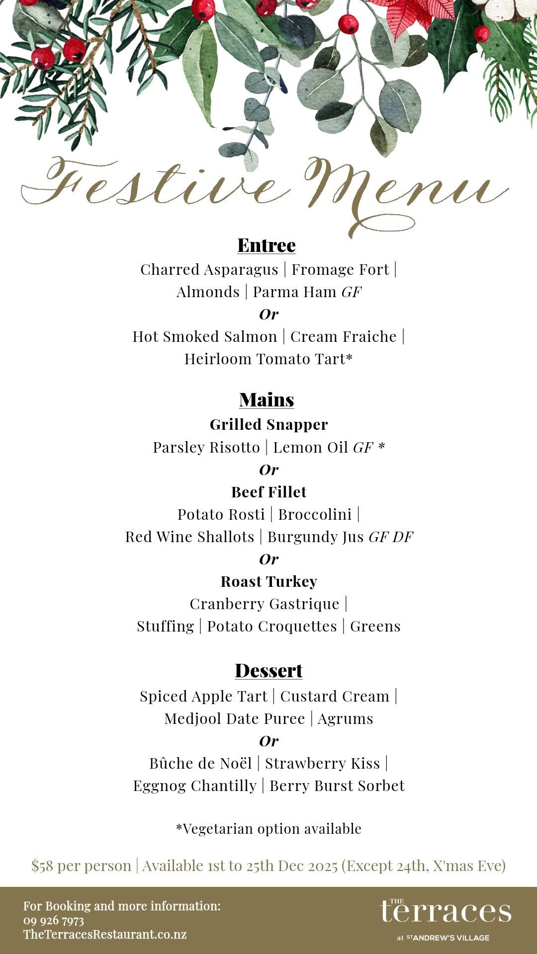 Celebrate the festive season at The Terraces with our specially curated holiday menus. View our menus below – tap to enlarge each menu for full details. Bookings are now open and we welcome both intimate gatherings and large group celebrations. Book early to secure your table for these popular festive dates.