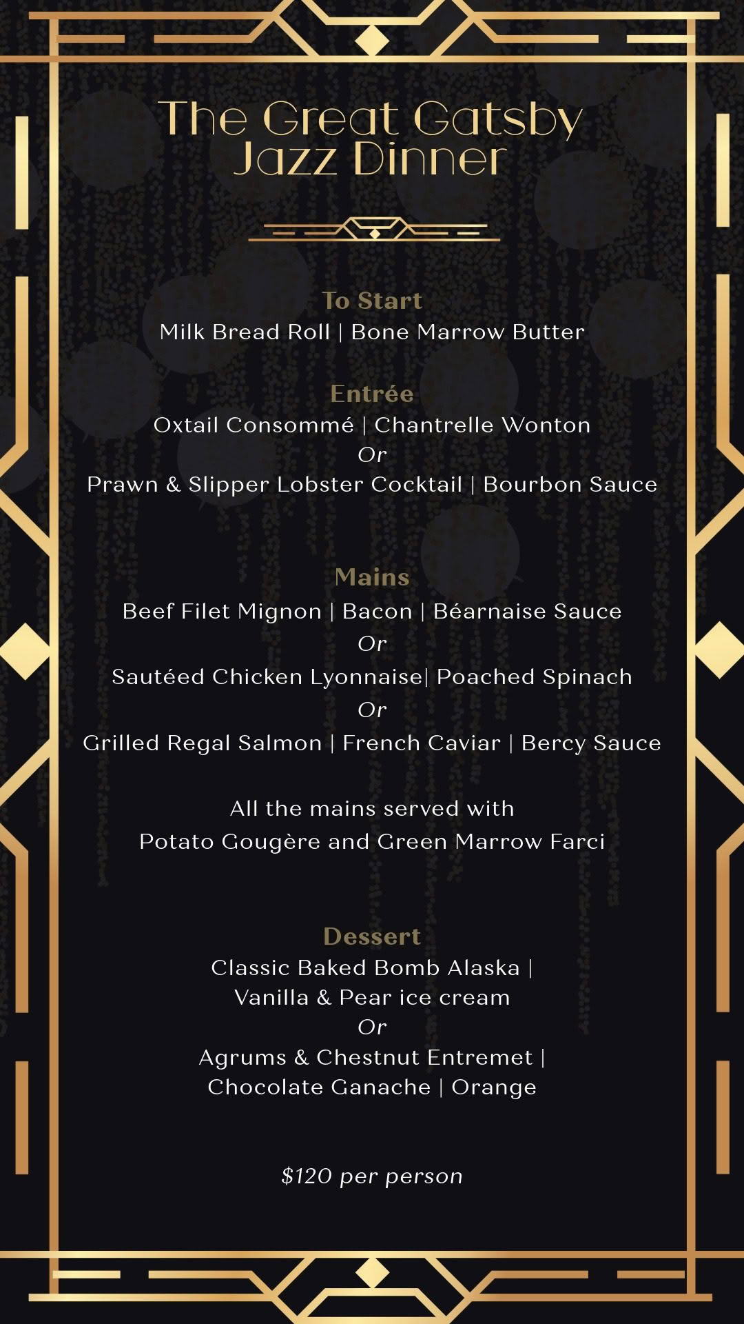 Step into an evening of true 1920s glamour at our Great Gatsby Jazz Dinner. Enjoy a beautifully presented three-course meal with a glass of champagne on arrival. The night will feature a captivating live jazz performance, bringing the spirit of the Jazz Age to life with classic 1920s melodies, lively swing rhythms, and a touch of modern flair. Combined with our beautiful setup and superb location, the evening promises an unforgettable blend of style, music, and celebration.